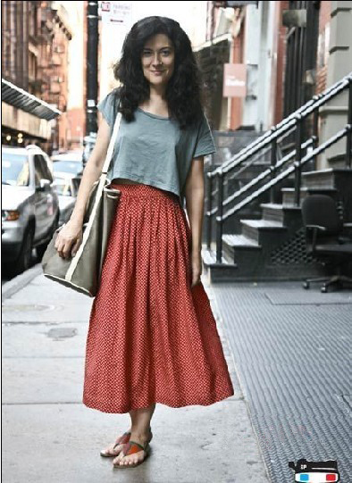 紅白波點(diǎn)印花長裙搭配灰色短版寬T,簡約有型。
