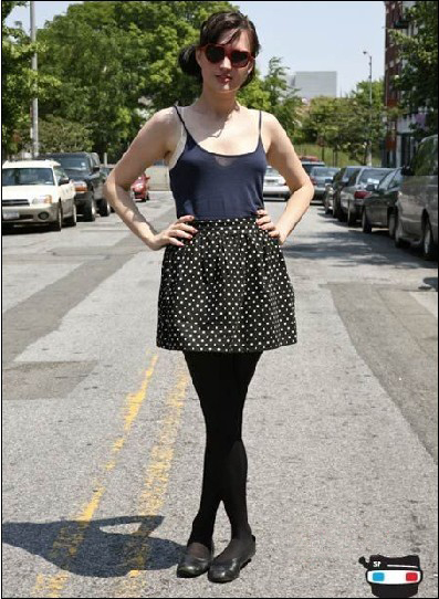 黑色吊帶搭配黑白波點(diǎn)印花短裙,可愛俏麗。