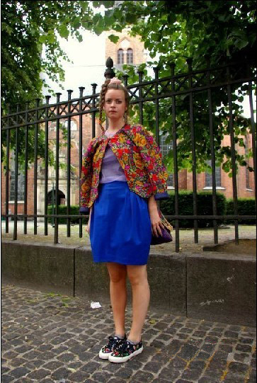有造型感的印花外套,搭配克萊因藍(lán)色高腰裙,十分有功力的搭配。