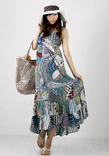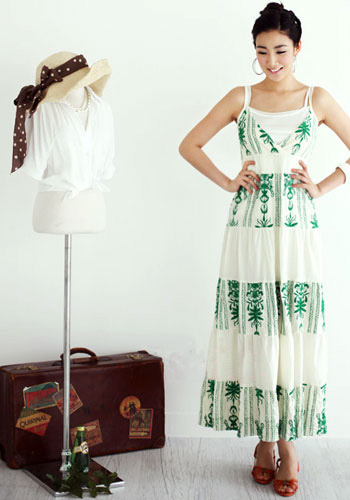 時尚解析:熱帶海洋風情蔓延的飄逸感,以淡雅的綠色民族印花營造出浪漫的氛圍。長長的裙擺好似在優(yōu)雅的曼舞一般。弗朗明哥的風情讓我們更加迷人性感,寬大的手鐲、耳環(huán)配飾更不能缺少哦!