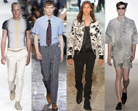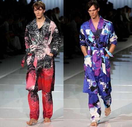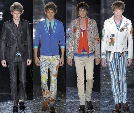 Alexander McQueen應(yīng)用對(duì)肋骨和煙霧的疊加效果,表現(xiàn)出男人亦柔亦剛的本色;Dries Van Noten對(duì)經(jīng)典波點(diǎn)進(jìn)行改造,形成不規(guī)則分散實(shí)點(diǎn);Dior Homme則用油墨效果的手繪畫(huà)形式表現(xiàn)出男性陽(yáng)光青春的一面;Marni以電光效果的幾何花朵圖案到達(dá)樸實(shí)化;Roberto Cavalli用上下對(duì)應(yīng)的水彩渲染畫(huà)暗示激情。