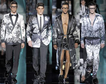 Dolce & Gabbana在墨色漸變的絲緞上畫(huà)出一幅幅中國(guó)工筆風(fēng)格的騰龍、花卉、青竹、猛虎。在絲光折射下,黑白線條黑白漸變?cè)谡蕉Y服上顯得格外風(fēng)情萬(wàn)種,完美打造出優(yōu)雅和激情并重的男人形象。