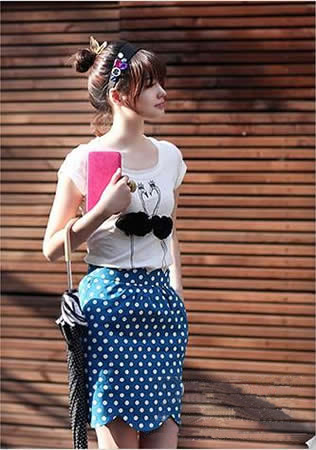 白點藍底高腰群搭配T很適合穿在辦公室里,這樣的花紋的裙子應該是很多達人們都有的單品方法吧,很優(yōu)雅、復古。