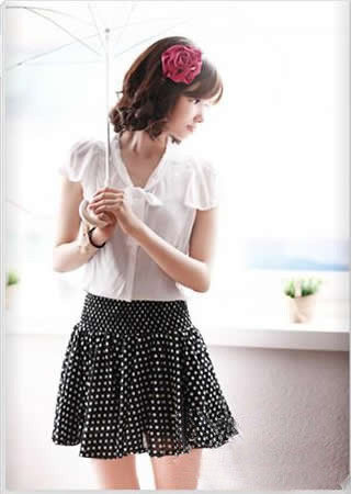 白色短袖上裝加圓點黑裙,甜蜜中透露出小小的性感。白色小圓點褶裙可愛動人,白色衣領挽一個蝴蝶結(jié),細節(jié)處的特別讓人刮目相看,整體也增色不少呢!