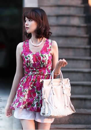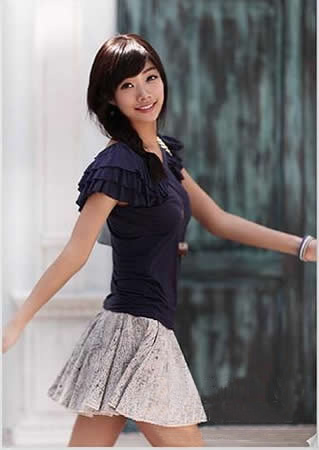印花超短裙,搭配蝴蝶袖紫色上衣,百分百夢幻少女裝,給人留下深刻的印象,想要走可愛甜美路線的MM不妨嘗試著搭配一下哦!