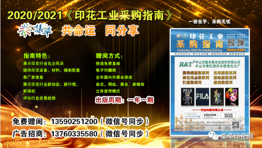 ﹒一冊(cè)在手 采購(gòu)無(wú)憂 去年,我們首版了《印花工業(yè)采購(gòu)指南》,收到了諸多行業(yè)客戶的好評(píng)和建議。 為了進(jìn)一步促進(jìn)印花產(chǎn)業(yè)無(wú)縫對(duì)接,印花產(chǎn)品供求無(wú)憂,印花資訊全盤(pán)掌握,在2020/2021《印花工業(yè)采購(gòu)指南》的編撰過(guò)程中,我們將延續(xù)以往的優(yōu)點(diǎn),改善去年的不足之處,爭(zhēng)取打造一本詳實(shí)、完整的行業(yè)采購(gòu)大全。 《印花工業(yè)采購(gòu)指南》由《印花世界》/集萃網(wǎng)編輯部出版,作為中國(guó)印花專業(yè)市場(chǎng)貨源信息傳播的招商平臺(tái),我們將本著打造中國(guó)印花界物資采購(gòu)的專業(yè)性綜合性刊物的宗旨,不負(fù)廣大客戶厚望,展現(xiàn)給大家劃時(shí)代意義的印花界寶典。 《印花工業(yè)采購(gòu)指南》將致力于服務(wù)整個(gè)印花產(chǎn)業(yè),成為一個(gè)集產(chǎn)品貿(mào)易、品牌宣傳、供需對(duì)接、技術(shù)交流于一體的高端商務(wù)平臺(tái)。它將憑借優(yōu)秀的傳播媒介和參考價(jià)值,成為印花行業(yè)運(yùn)營(yíng)商、采購(gòu)商的重要參考讀本,成為企業(yè)負(fù)責(zé)人和業(yè)務(wù)采購(gòu)人員一本必備的工具書(shū)。