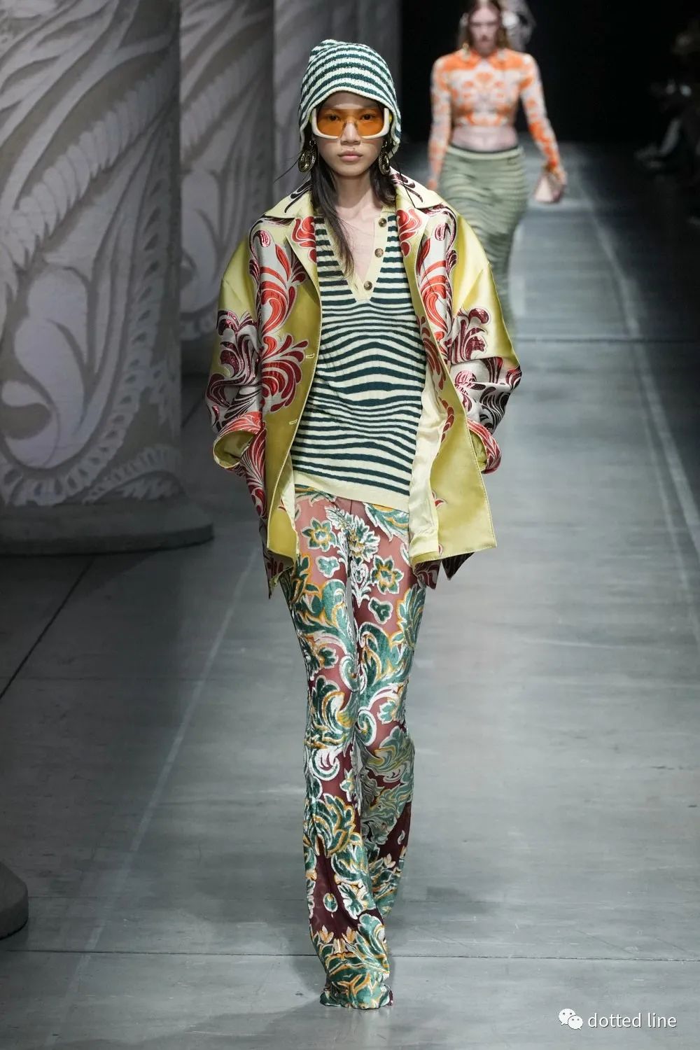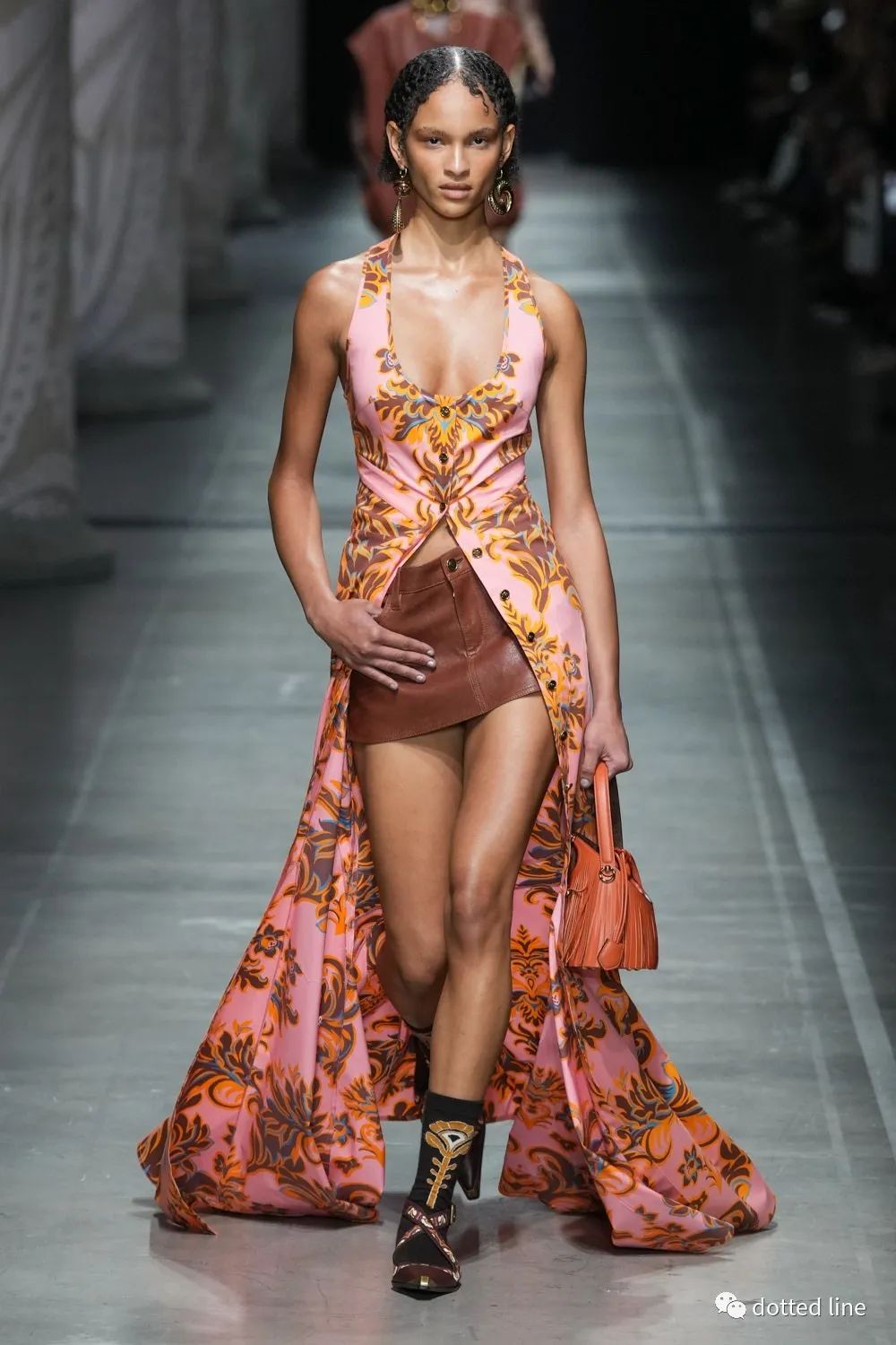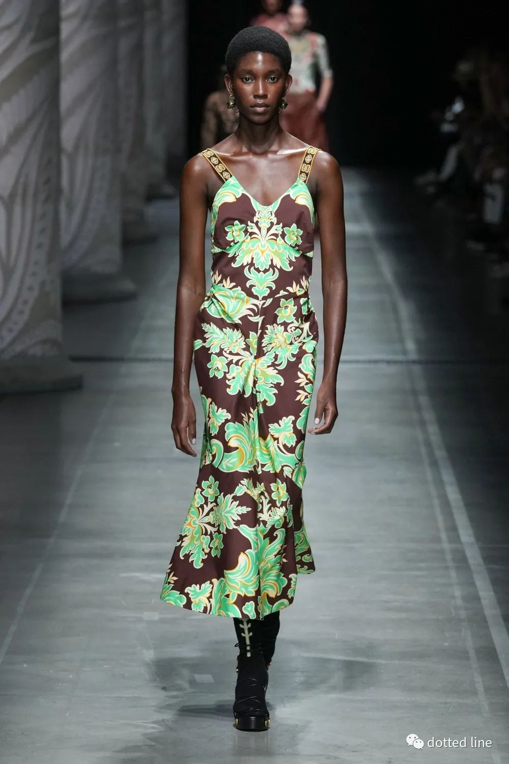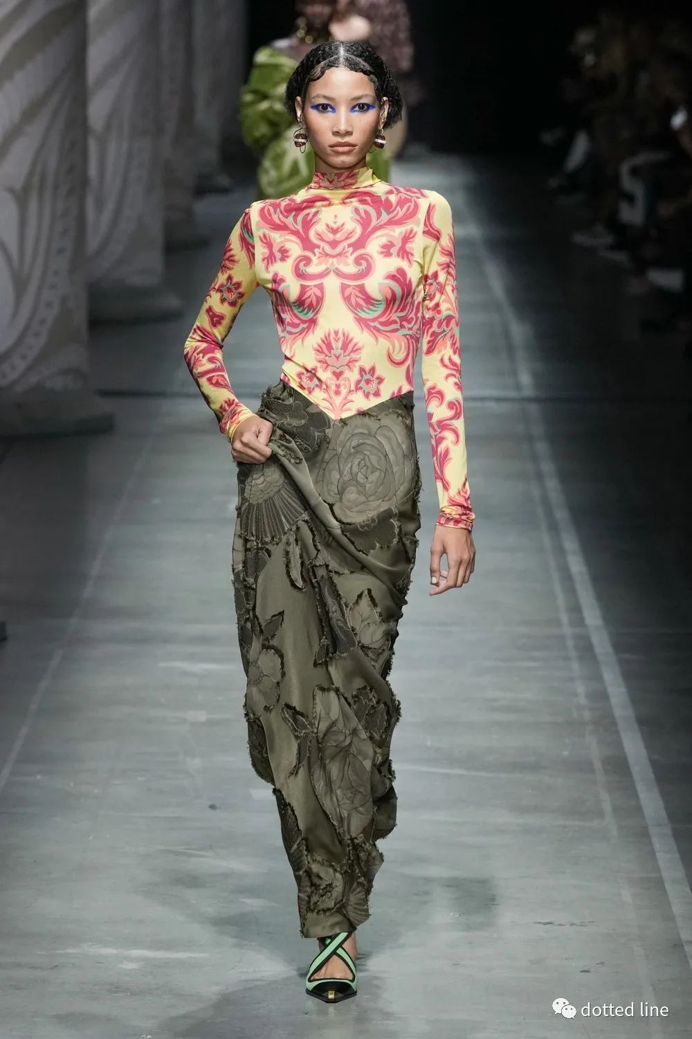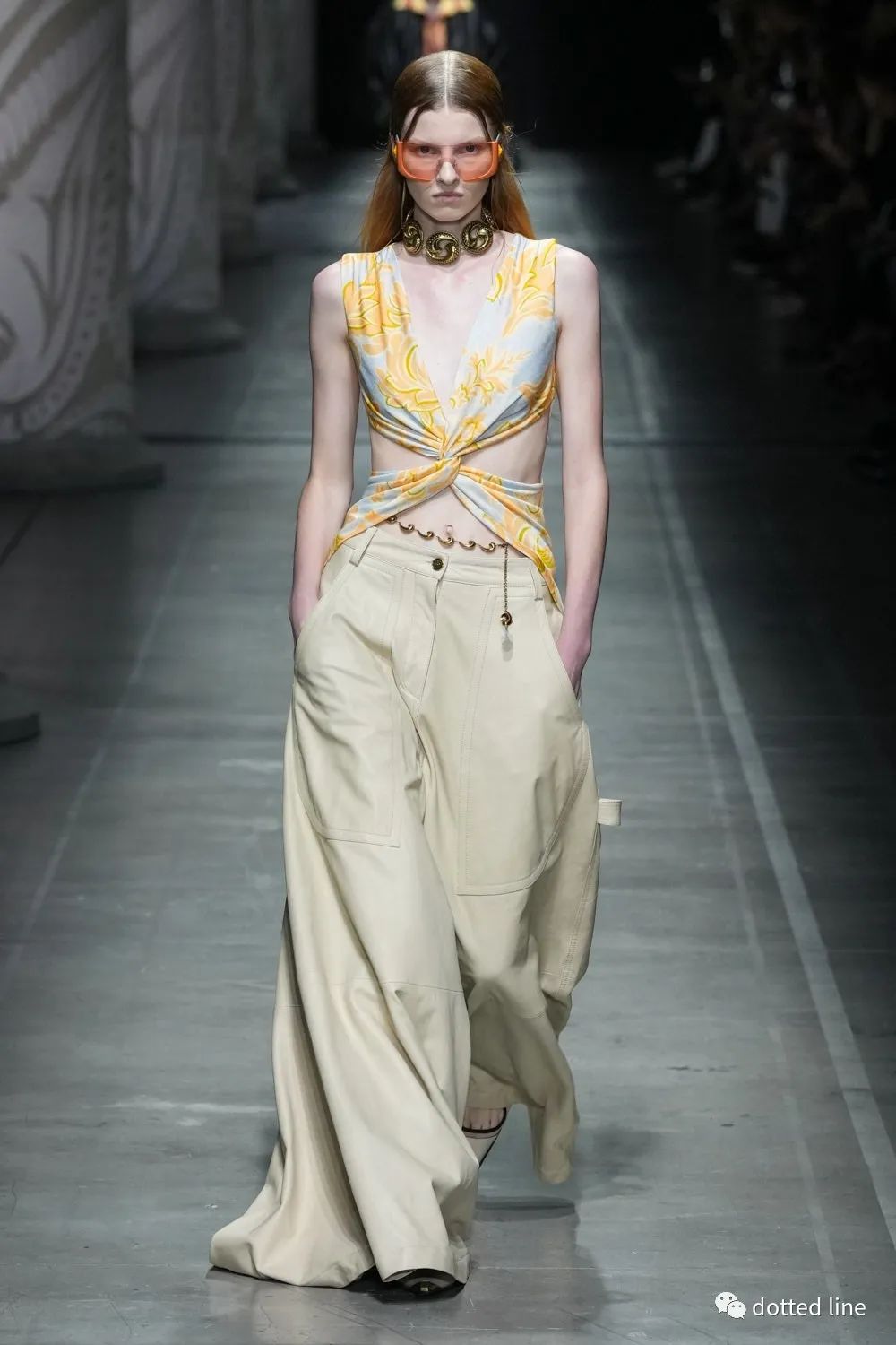 一切都充滿了輕盈感,帶著某種松弛與豁然開朗。在廓形中將圖案無序自由疊加交織,又以極精準(zhǔn)的剪裁塑造線條筆直強(qiáng)烈的縱向感,在服裝底部展開,打造延伸感和貼合感,為了進(jìn)一步營造幻境,設(shè)計中還融入了古老的邁錫尼圖騰,象征著好運。