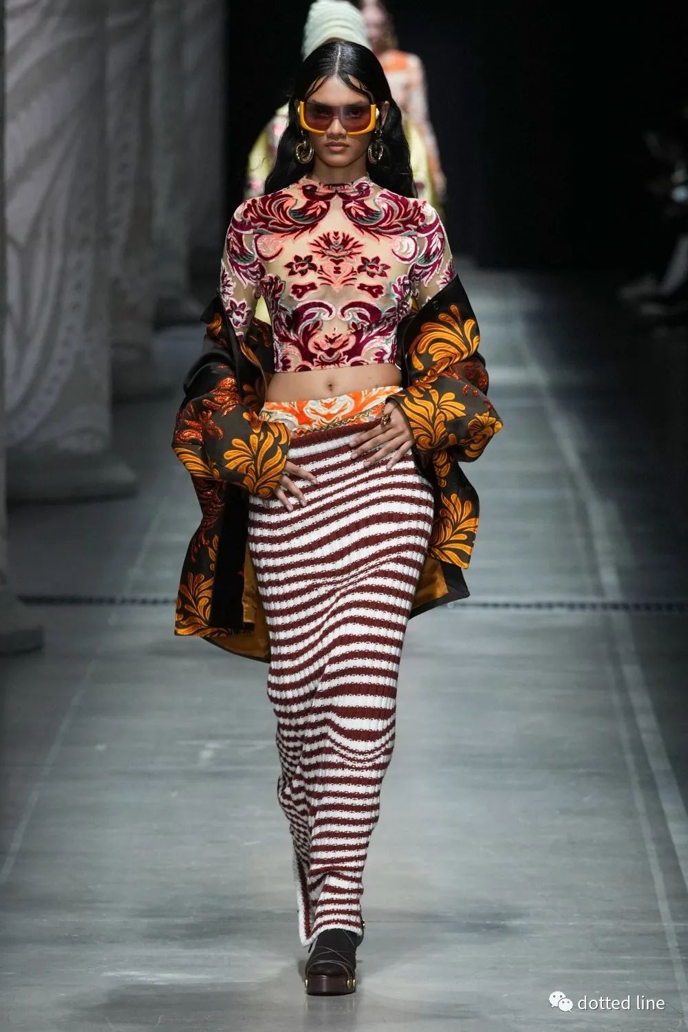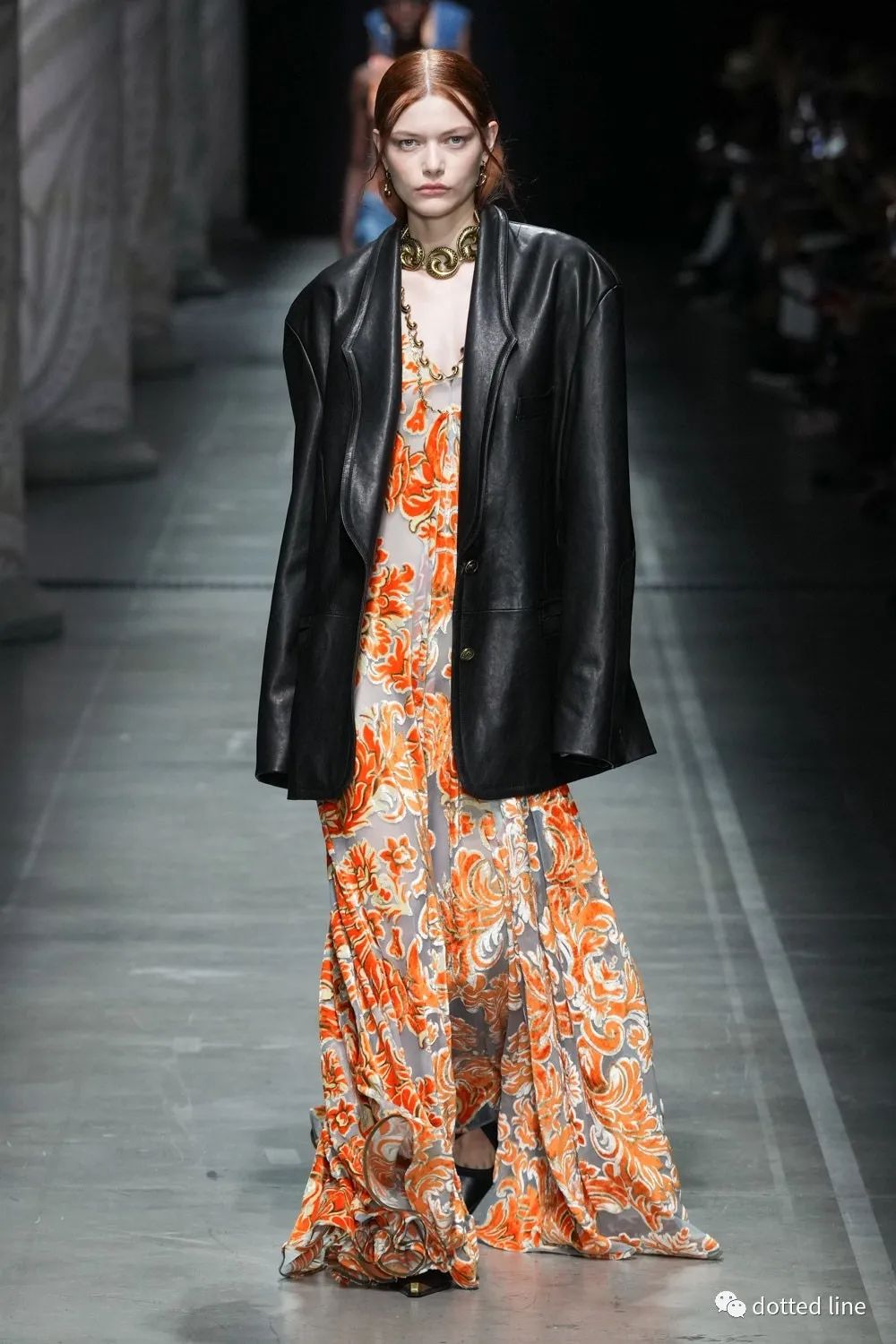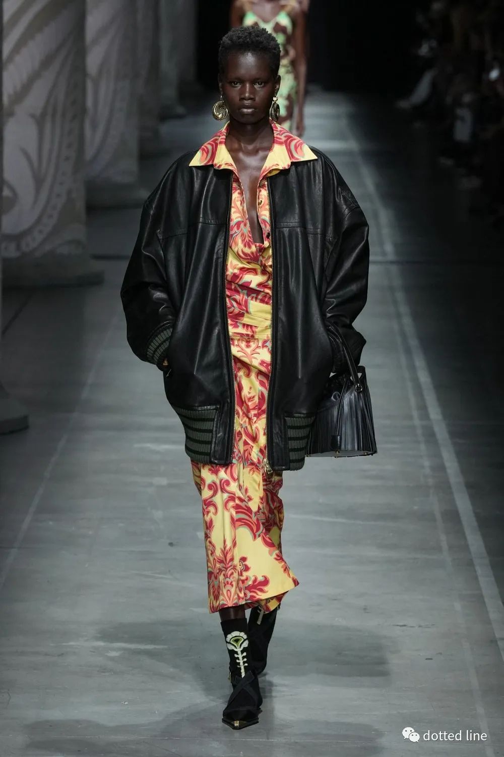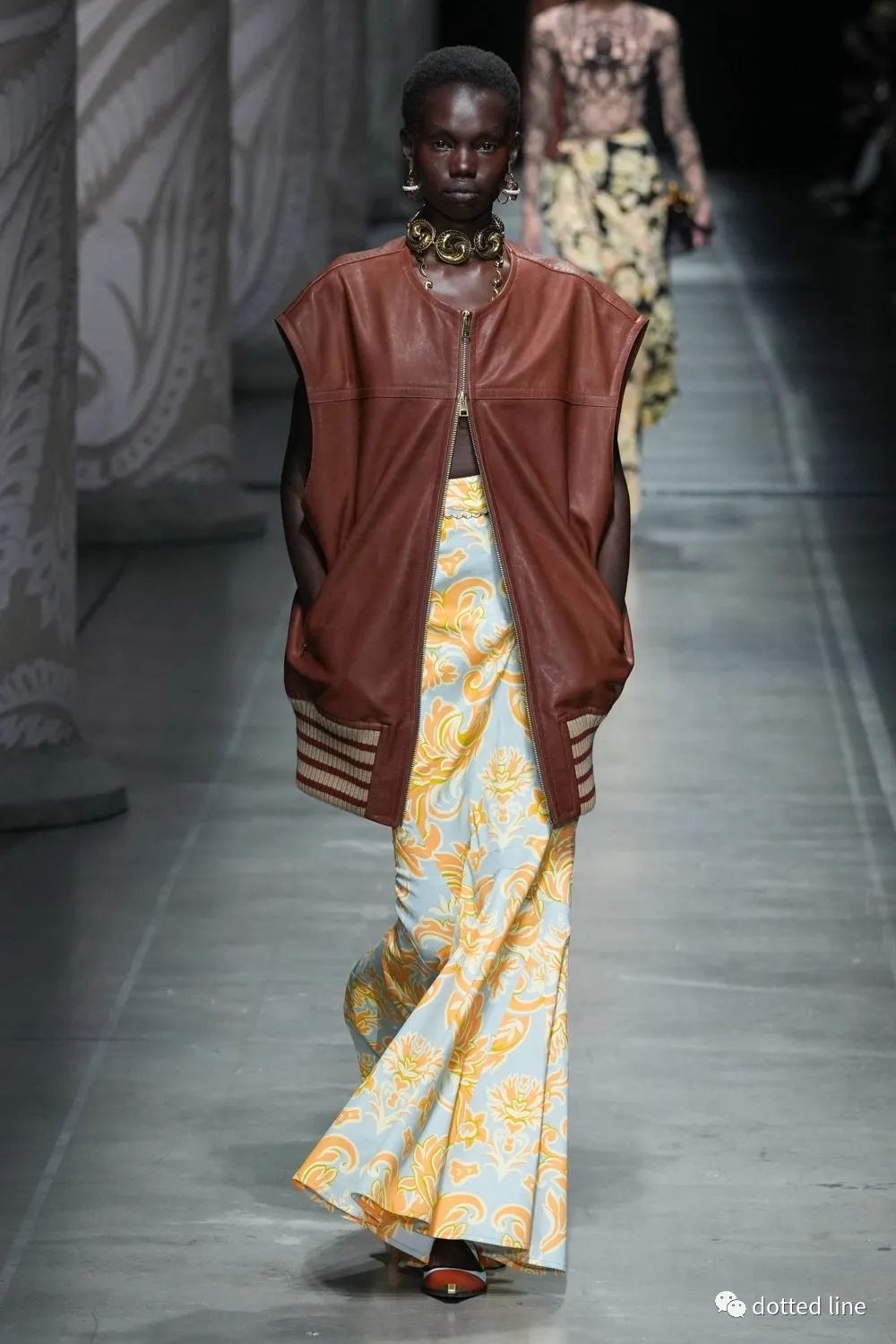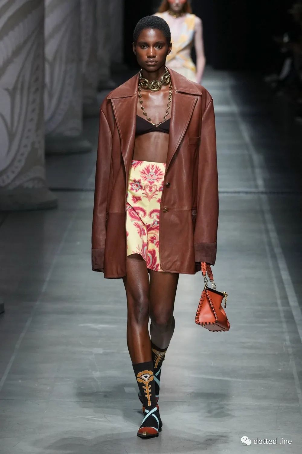 一切都充滿了輕盈感,帶著某種松弛與豁然開朗。在廓形中將圖案無序自由疊加交織,又以極精準(zhǔn)的剪裁塑造線條筆直強(qiáng)烈的縱向感,在服裝底部展開,打造延伸感和貼合感,為了進(jìn)一步營造幻境,設(shè)計中還融入了古老的邁錫尼圖騰,象征著好運。