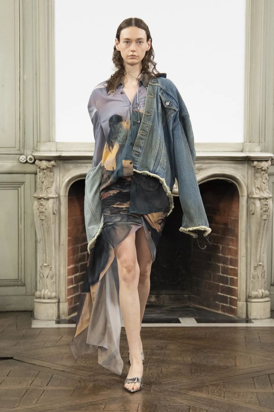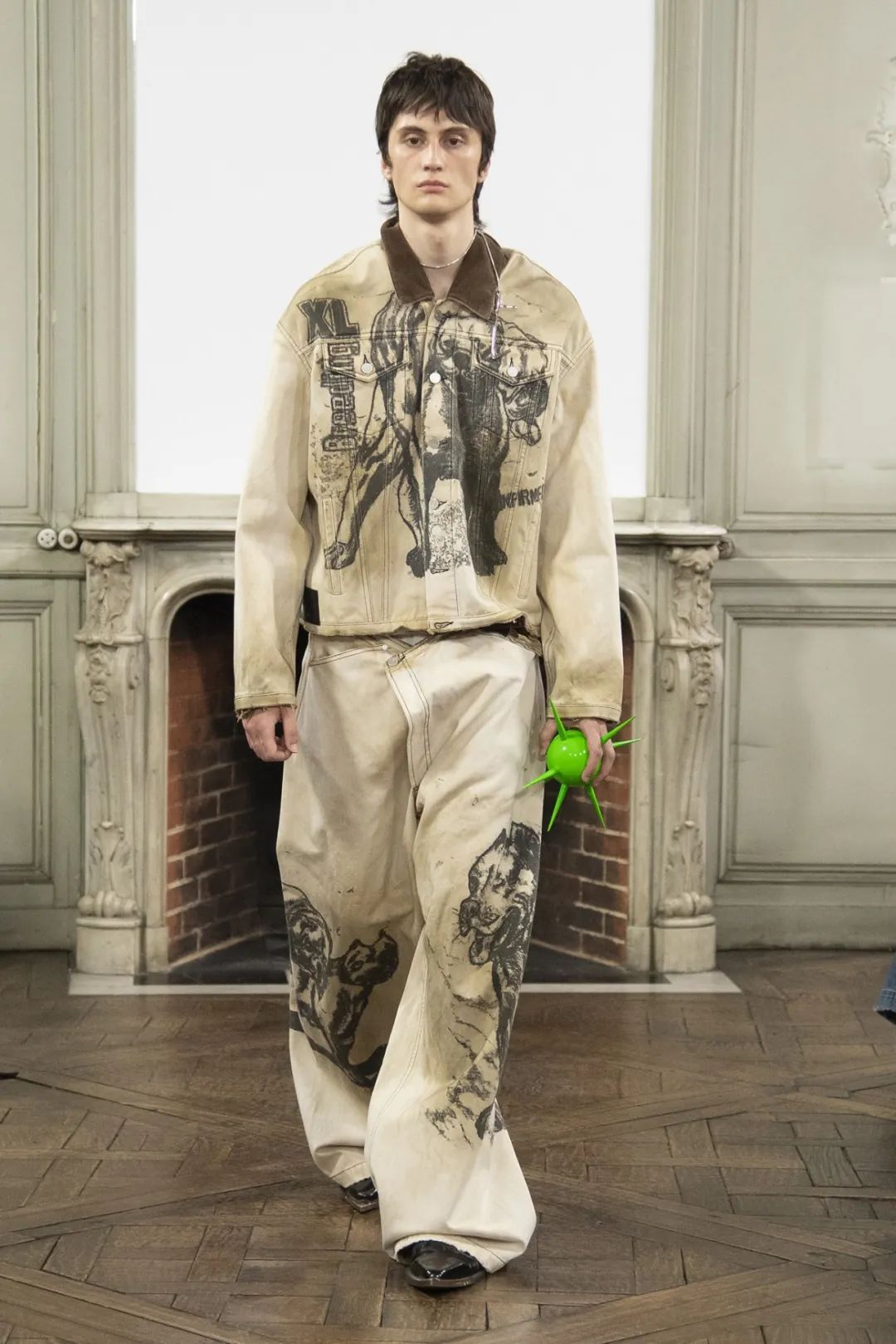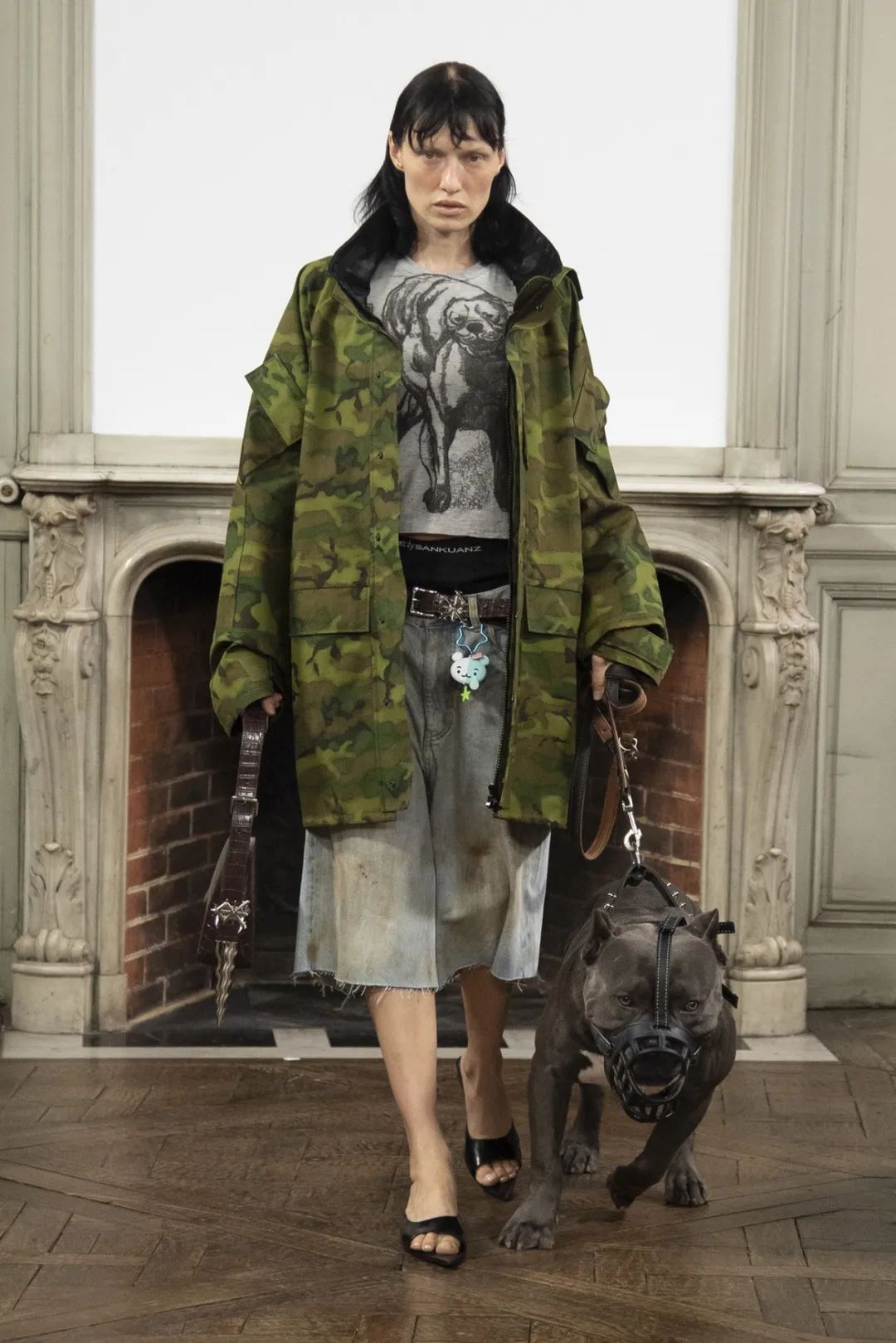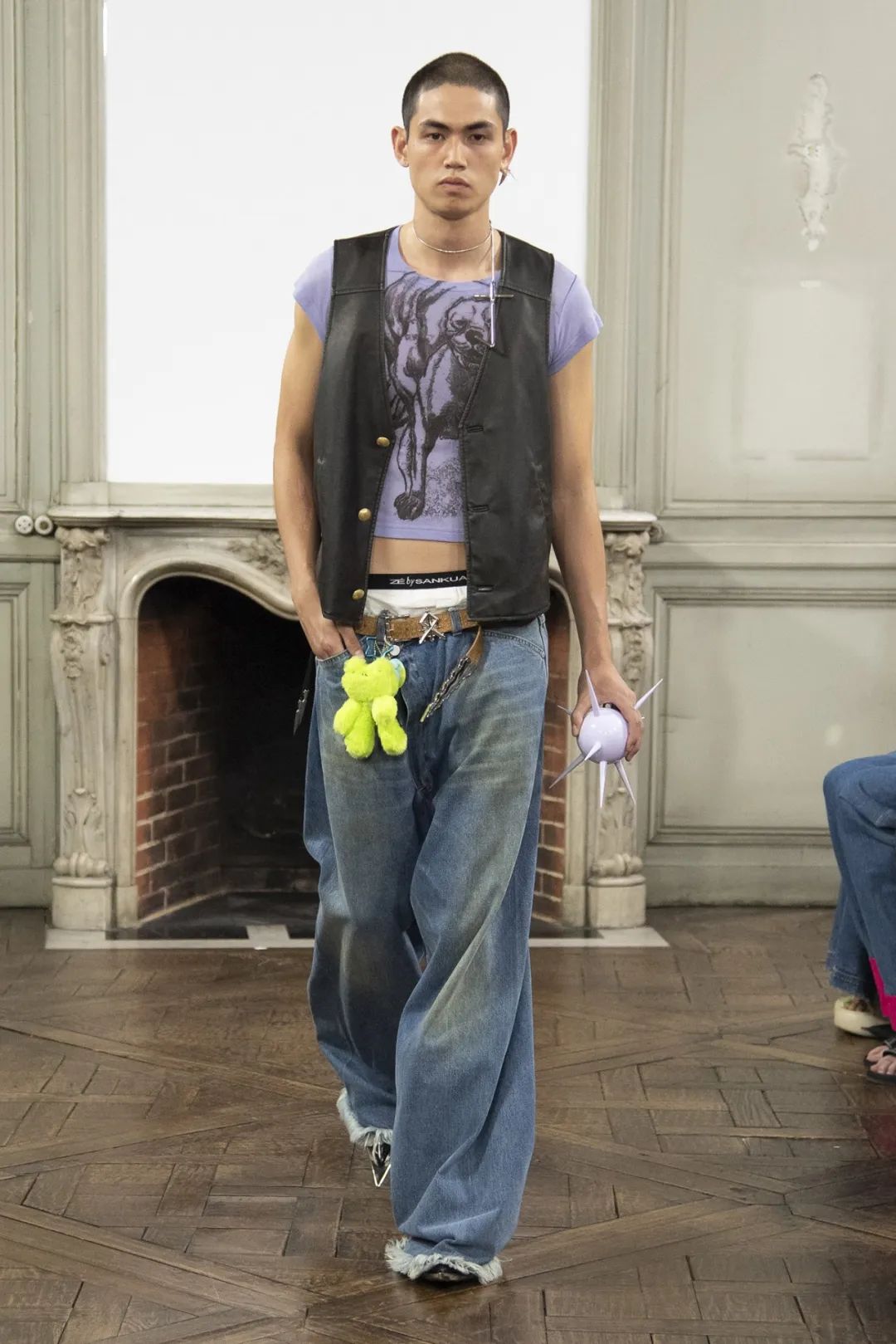 SANKUANZ上官喆的時裝作品具有深度融合的特征,不同形式的服裝被重組后以類制服的形態(tài)展示出來,展現(xiàn)出強硬內(nèi)核的集體主義風(fēng)貌。作品中具有宗教氣息的符號系統(tǒng)也是其另⼀顯著特征。這些觀念和形式在其時裝系列里最終回歸到青少年的形象當中。