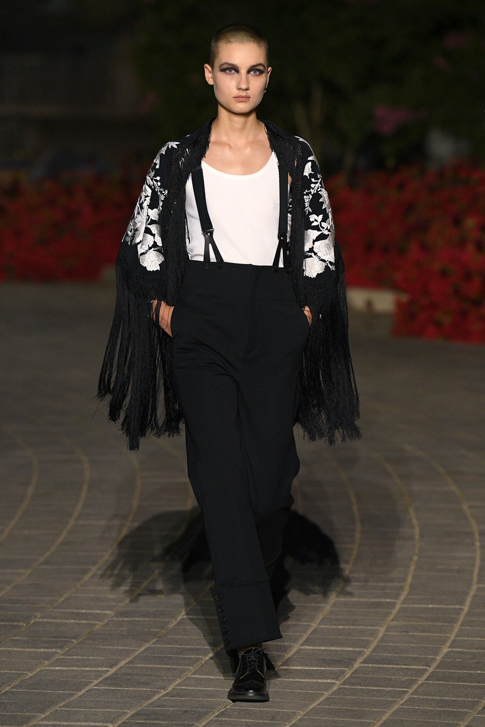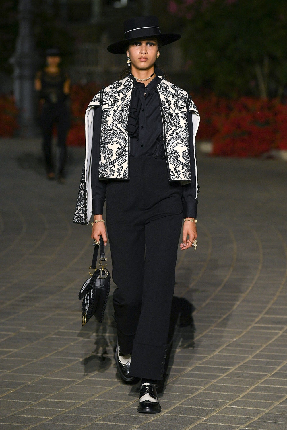 迪奧女裝創(chuàng)意總監(jiān)MARIA GRAZIA CHIURI將品牌秀場搬到塞維利亞西班牙廣場,以西班牙藝術(shù)家、弗拉門戈舞者卡門·阿瑪亞為靈感繆斯,將背帶褲、短夾克、斗篷、騎士褲裝等充滿游牧風情的單品,與洋溢著熱情與活力的紅色、黃色、赭石色與黑色塔夫綢半身裙融為整體,充滿別樣的西班牙式浪漫。