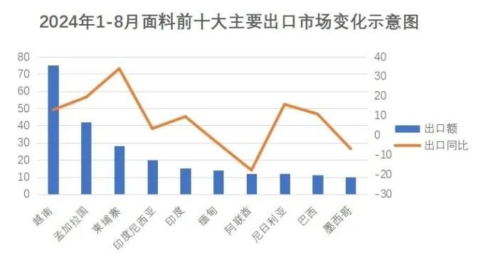 今年1-8月,越南作為我面料出口最大的單一市場(chǎng),占我面料對(duì)全球出口的16.8%,出口額74.9億美元,同比增長(zhǎng)12.9%。