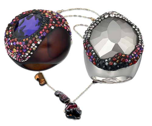 這是施華洛世奇首次嘗試將五彩斑斕的水晶鑲嵌在木質(zhì)戒托上,技術(shù)相當(dāng)先進(jìn),同系列還有手鐲、項(xiàng)鏈等款式可選?雌饋(lái)覺(jué)得眼熟?沒(méi)錯(cuò),施華洛世奇贊助過(guò)AlexanderMcQueen、Hussein Chalayan等設(shè)計(jì)師,雙方的設(shè)計(jì)均有共通之處。靈感來(lái)自水滴的Hyacinth戒指在銀色主色調(diào)中加入了巴洛克風(fēng)格的彩色水晶,并在戒托部分施以霜化處理,做工細(xì)致。此款Helium項(xiàng)鏈的吊墜造型在具象的牡丹花瓣與抽象線(xiàn)條間游走,并在局部加入了日式折紙?jiān),鎖鏈的設(shè)計(jì)適合與街服混搭。