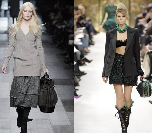 這次Burberry繼續(xù)堅(jiān)持融合了鄉(xiāng)村氣息的朋克搖滾風(fēng),來自英倫超市的霧靄村莊中走出的個(gè)性女郎,分不清是入世還是出世。超長(zhǎng)款的V領(lǐng)套頭毛衣搭配中長(zhǎng)灰呢裙子,修長(zhǎng)的外形拉長(zhǎng)了懷舊的氣息。