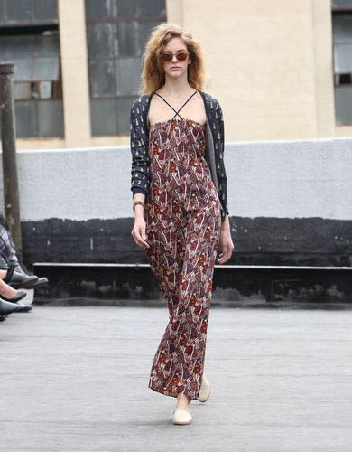 她的設(shè)計整體系列以濃烈的印花、改良的四零年代為主軸,而那些令人莞爾的趣味印花洋裝靈感來自Rachel Comey最近閱讀的Houdini傳記,另外還包括了:袖長至手肘處的Y字型古董西裝短外套、內(nèi)搭小圓點/碎花/印花雪紡長袖襯衫;還有些頭巾帽飾、以及腳鏈等小飾品。甚至還將Seanceon a Wet Afternoon書名印制於襯衫上,絨毛、卡其咖啡色系、如小羊駝呢般的皮草等等,處處充滿著驚喜與幽默感;如果,Comey少了這些高彩度的色系及瘋狂的細節(jié)設(shè)計,只是恰到好處的融合色彩與印花,或許就顯得普通,倒不如在這場秀展中來得燦爛美好。