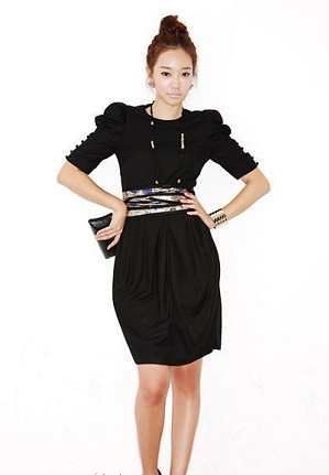 純凈的黑色洋裝設計簡約,strong shouler的肩部設計感強烈,是今年時尚界最流行的元素!中袖的貼身設計包裹雙臂,袖子上的紐扣帶來特別的feeling,絢爛的印花繩帶點綴在裙子的高腰位置,整個造型非常搶眼,高貴的感覺縈繞其中!
