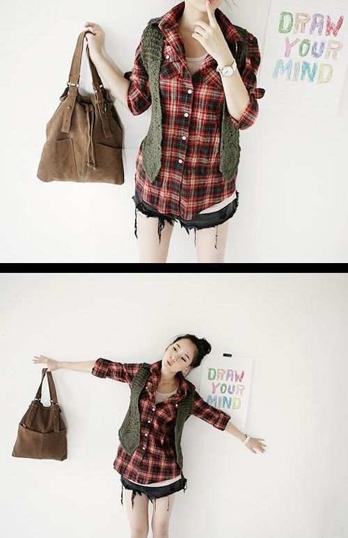 時(shí)尚評(píng)論:紅色的格紋從不會(huì)隨著時(shí)尚的潮流而逝去,格紋襯衣乖巧又顯得青春,還十分的好搭配,簡(jiǎn)單。搭配綠色鏤空針織馬甲,小巧又顯得時(shí)尚可愛。里面長(zhǎng)款白色T恤下擺露出一截更加的有層次。搭配一條短褲露出白皙的腿部,非常的誘惑性感。