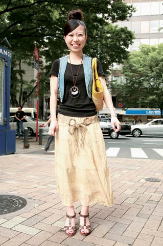 黑色與檸檬色的裙裝搭配看起來并不呼應(yīng),裝扮的重點在于牛仔馬甲和草編挎包,流露出黑T恤的帥氣。