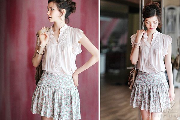 時尚點評:清新的淺藍(lán)色配上可愛的桃花印花圖案,清爽又不失甜美,腰部位置特別設(shè)計的皺褶助你塑造纖腰,裙子的下擺的帶出細(xì)膩的少女情懷,搭配淺粉荷葉邊襯衣帶給你甜美優(yōu)雅的感覺,他的眼光怎么可以從你身上移開呢?