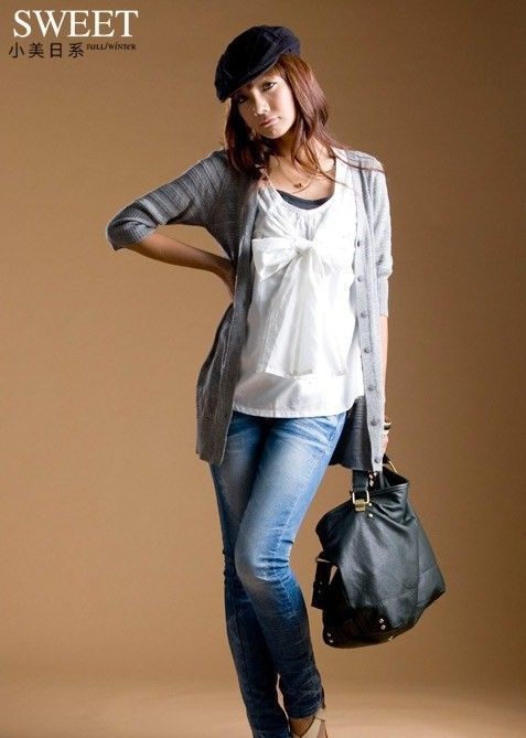 時(shí)尚點(diǎn)評(píng):純白色的上衣搭配修腳的牛仔褲充滿了浪漫的淑女味道,胸前綁起的蝴蝶結(jié)甚為搶眼,優(yōu)雅的感覺盈滿身心,外搭灰色的長(zhǎng)款針織外套就已經(jīng)很好看,輕薄的針織外套隨意地皮在身上,層次感的搭配讓你魅力大增哦。