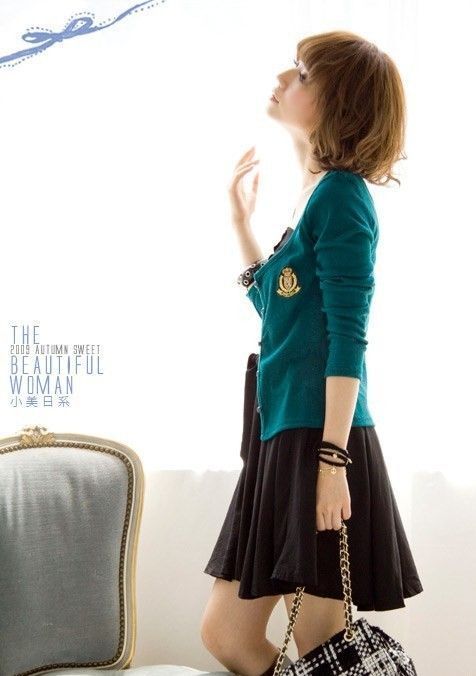 時(shí)尚點(diǎn)評(píng):黑白色的搭配非常經(jīng)典,黑色的短裙帶來秋冬季節(jié)的浪漫之風(fēng),外搭深綠色的針織外套顯得優(yōu)雅十足,英倫格濃厚的搭配讓你一嘗校園風(fēng)的甜美時(shí)尚!