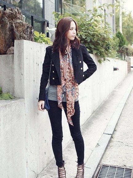 短款的西裝外套承接前幾年風(fēng)靡街頭巷尾的短外套,帶來英倫風(fēng)情的貴族魅力西裝外套,仿軍裝的設(shè)計(jì)讓潮女也很喜歡哦~一身偏暗色調(diào)搭配的造型因?yàn)橛辛伺宋兜挠』ńz巾點(diǎn)綴其中,魅力直線上升哦!