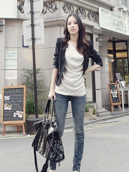 質(zhì)感非常棒的白色上衣,流暢感的布料穿起來非常舒服,層層的褶皺把mm的身材顯得相當(dāng)苗條,搭配短款的西裝外套感覺自然有魅力,不是只有男人才能把西裝+牛仔褲穿得有型帥氣,女人也能carry得非常棒哦!