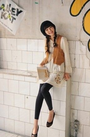 田園風(fēng)的米白色連衣裙充滿了甜美的氣質(zhì),搭配黑色緊身褲就已經(jīng)潮味十足,牛仔feel的卡其色馬甲與米白色的裙子在顏色上就已經(jīng)很相融,秋冬季節(jié)很流行的麻花辮子讓MM氣質(zhì)出眾,非常搶眼哦~