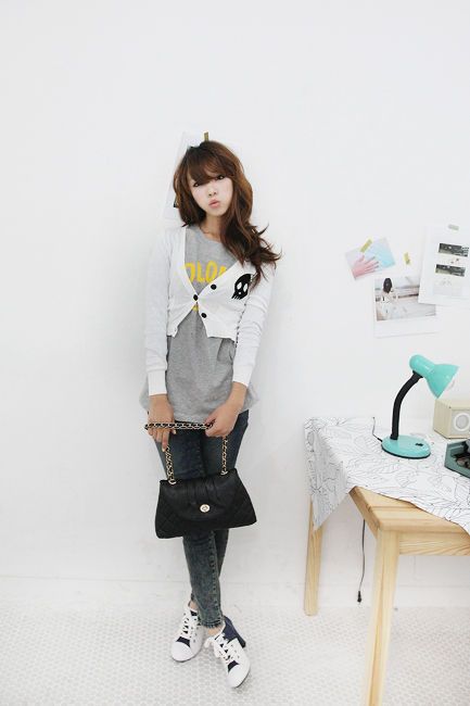 長款T恤搭配修腳的牛仔褲充滿了休閑為,今年很hit的高跟運(yùn)動(dòng)鞋非常特別,T恤外搭骷髏頭黑白短外套非常有潮味哦!