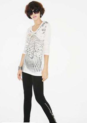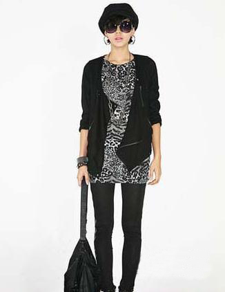 時(shí)尚點(diǎn)評(píng):豹紋和虎紋交織的黑白長(zhǎng)款T恤,搭配不規(guī)則的拉鏈外套,酷極了!黑色的緊身褲今年秋冬的大熱單品,黑色羅馬高跟鞋,小小裸露的誘惑。整體搭配以黑色為基調(diào),低調(diào)神秘,同時(shí)還有一點(diǎn)野性,非常有型!
