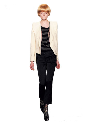 休閑感十足的條紋T恤搭配修身仔褲當(dāng)然沒什么新鮮,不過用來搭配強(qiáng)勢的優(yōu)雅套裝感覺就大不一樣了!學(xué)會用風(fēng)格迥異的單品混搭是必備一課。