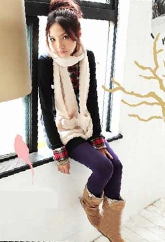 搭配建議:“格子控”喜歡的獨特袖口設計,黑色的毛衫搭配紫色legging,深色調的組合,讓上班族也變得越來越潮了,圍巾隨意的系在脖子上,甩掉沉悶的黑色顏色吧。