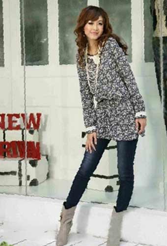 灰色印花長衫搭配修身牛仔褲設計