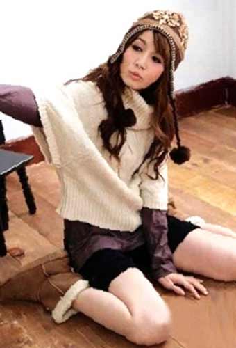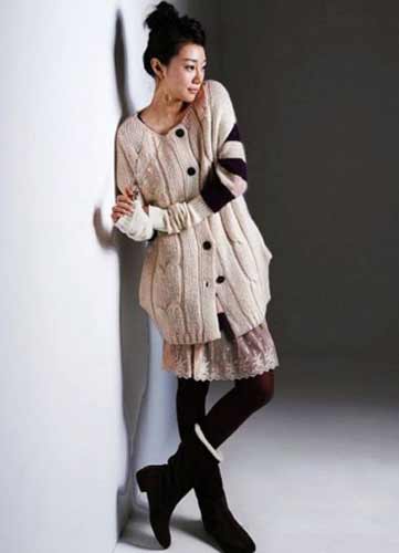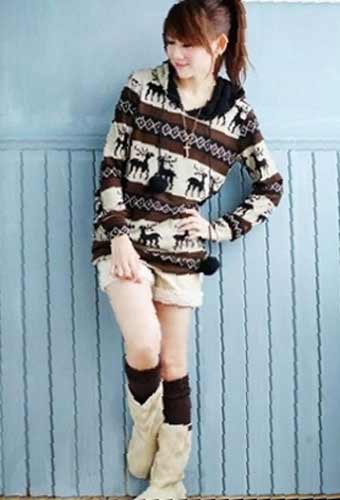 搭配建議:花紋圖案的帶帽式長毛衣,掩藏了腰部的缺陷,淺灰色短褲與咖啡色針織襪的搭配,拉長了腿部的線條,做個恬靜的女職員吧。