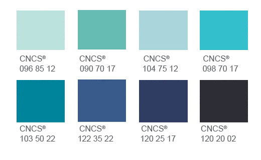 漂白水色、淺藍(lán)、水藍(lán)、藍(lán)橙色、阿爾及爾藍(lán)、明鈷藍(lán)、暗藍(lán)色構(gòu)成一組樂觀、充滿希望、漣漪和探索精神的色彩組合。色調(diào)漸變的藍(lán)色通常與亮白和藏青色搭配使用。