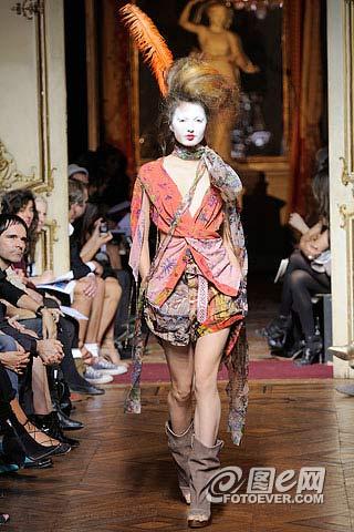 Vivienne Westwood那些附著在衣服上的嵌花編織工藝,以及裹身或者懸垂的裙裝外古怪的廓形裝飾,毫無章法的民族感印花和乖張的造型完美呼應(yīng),給人以不可言喻的視覺感受。
