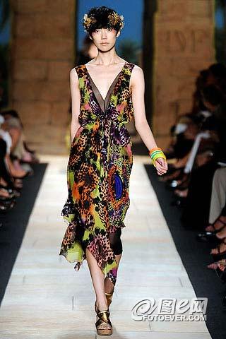 Diane von Furstenberg印花絲質(zhì)顏色跳躍鮮明,而且廓型非常時髦。熒光色彩中巧妙加入暗色調(diào),和飄逸的真絲質(zhì)地完美呼應(yīng)。