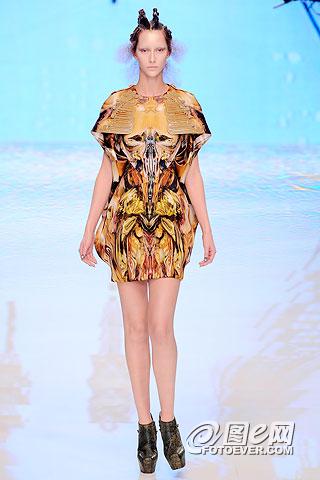 Alexander McQueen的2010春夏系列——柏拉圖的亞特蘭蒂斯。McQueen精心處理的海洋爬行動物印花。數(shù)碼印制爬行動物圖案的短裙打破了人們一貫認(rèn)為動物紋樣應(yīng)用的法則,而古海洋怪物的裝甲頭部般奇形怪狀的鞋子也讓人大呼設(shè)計師的氣死妙想。每件裙子都是兼具計算機藝術(shù)與McQueen標(biāo)志性的高級定制剪裁工藝的作品。
