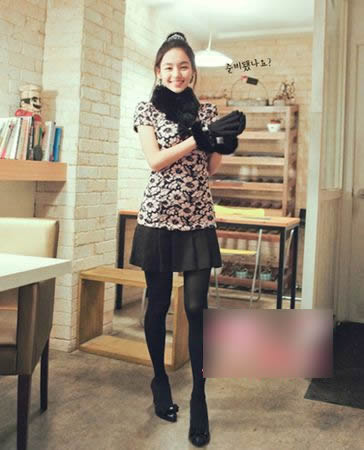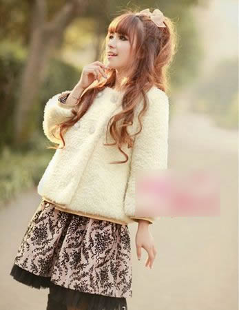 復古的花紋圖案點綴在粉色裙擺上不經(jīng)意的露出黑色紗襯,搭配短絨毛雙排扣外套。精致的裝扮仿佛芭比娃娃一樣惹人喜愛。