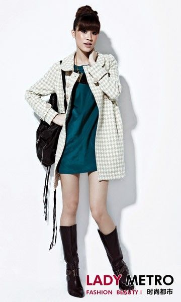 腰部收省的直身型大衣?lián)碛械溲诺脑煨洼喞,千鳥格的花紋更增添視覺效果。搭配一條亮麗富有質(zhì)感的連衣裙和流蘇包,立刻充滿了律動(dòng)感。