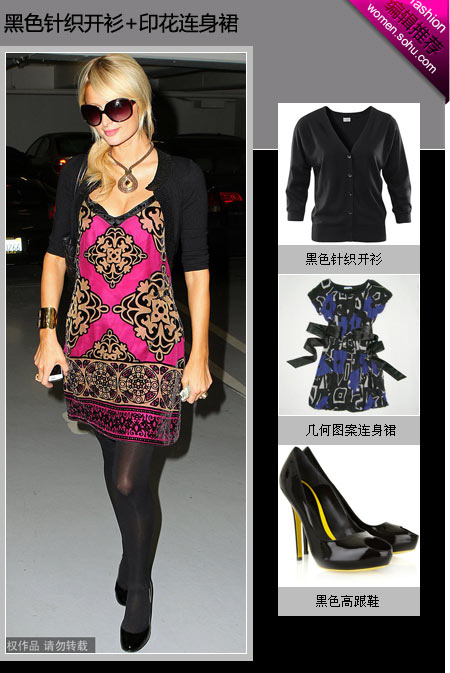 黑色針織開衫+印花連身裙