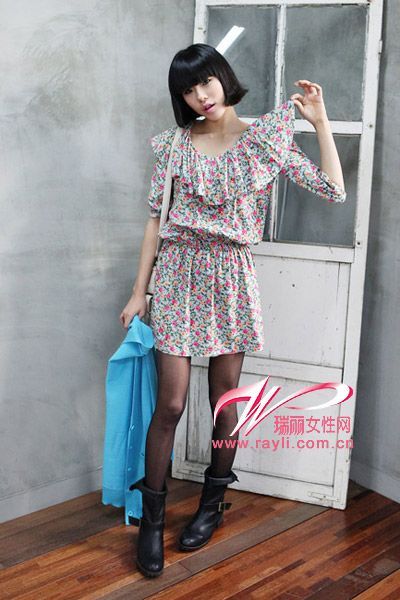 素雅小花與咖啡色腰帶營(yíng)造低調(diào)的個(gè)性張揚(yáng),在暖暖的春日,搭配上帥氣的網(wǎng)格褲襪和系帶靴,成功詮釋日系范兒。