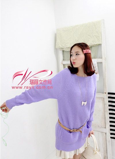 寬松版淡紫色豎條紋針織搭配白色雪紡小裙,以編織細(xì)腰帶束腰,簡(jiǎn)單配色是休閑裝扮的關(guān)鍵。