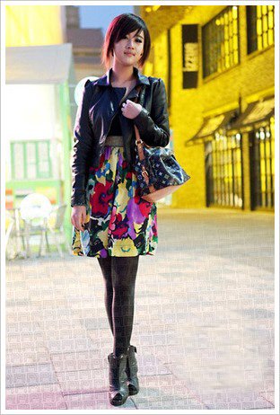 春天到了,花朵有回溫趨勢,大朵的鮮艷花色是個性大膽的姑娘的首選,搭配上小皮衣有種柔與剛混合的美