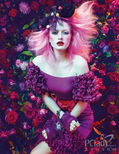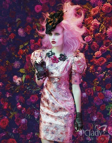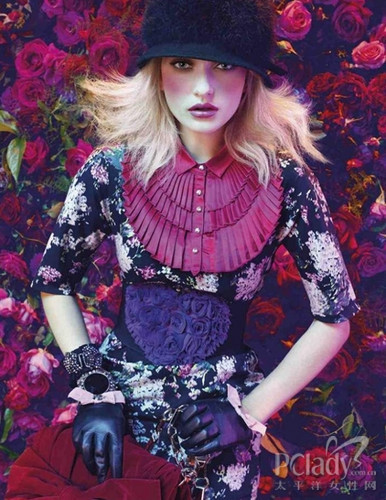 美麗的紫紅色百折花邊詮釋女性優(yōu)雅的頸部胸部曲線,大面積不過肩色塊讓模特的身型更加纖細。腰部的蘭色玫瑰花束和印花連衣裙相映成趣,玫瑰紅色的包抱、飾粉紅絲帶黑手套、黑色小禮帽,所有配件都完美突出自身的存在感,感覺甜美可人。