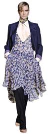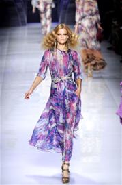 不負(fù)責(zé)任地加以揣測(cè),這個(gè)春天的藍(lán)紫色碎花風(fēng)潮,多少與《阿凡達(dá)》及《愛(ài)麗絲夢(mèng)游仙境》有些許關(guān)聯(lián),畢竟時(shí)裝與電影結(jié)緣已久,相輔相成一道發(fā)財(cái)?shù)牡览,想必早在你我于此橫加猜測(cè)瞎動(dòng)腦筋前很久就明了了。拋開臆想不談,究竟為什么是藍(lán)紫色碎花?應(yīng)該是高級(jí)時(shí)裝界“后經(jīng)濟(jì)危機(jī)”時(shí)代的過(guò)渡產(chǎn)物吧。雖然尚未從此波經(jīng)濟(jì)危機(jī)中全身而退,但身為高級(jí)時(shí)裝的權(quán)威與自信,以及對(duì)于美好未來(lái)的樂(lè)觀憧憬,促使設(shè)計(jì)師們?cè)诒J赜^望及藝術(shù)創(chuàng)作間取得微妙的平衡:既是淡淡流露出一絲裹足不前的擔(dān)憂的藍(lán)紫色,又有充滿濃郁藝術(shù)氣息的女人味十足的美不勝收的小碎花,當(dāng)它們合二為一時(shí),又顯得那么好穿,平時(shí)只有嬌小甜美姑娘才能駕馭的小碎花,在藍(lán)紫色的庇護(hù)下,也能讓豐腴身材的女生披上身,且更多了一份不食人間煙火的冷傲氣質(zhì)。同樣一條印花連衣裙,Erdem繼續(xù)其近郊花季少女路線,ETRO則做得飄渺無(wú)比,氣場(chǎng)強(qiáng)烈,RobertoCavalli更把它與中性男裝和諧相搭營(yíng)造貴族氣息。若還是對(duì)挑戰(zhàn)這樣一條印花連衣裙不甚自信,亦可參考Rochas的藍(lán)色西裝搭法,僅在領(lǐng)口微露印花襯衫,以及束扎于腰際一側(cè)的同色花朵,俏皮帥氣,恰到好處的女生氣息足夠內(nèi)斂。