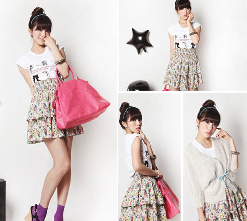 搭配建議:碎花蛋糕裙絕對是減齡扮嫩好拍檔!當十八歲的青春年華已成往事,我們又開始不斷懷念的時候,就要學會寵愛并縱容自己。半身裙特意拉得靠上,這樣能夠拉成身形,小個子女生可以仿效哦!除此之外,坡跟小涼鞋也是整個造型的必選鞋品。