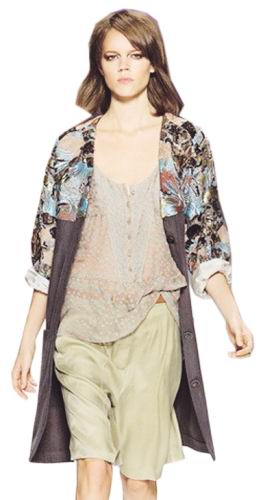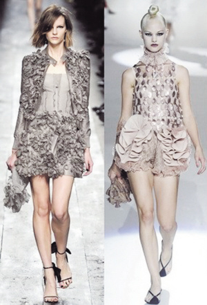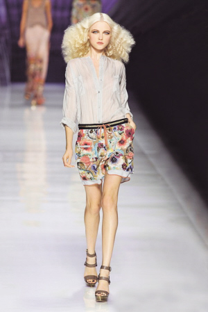 2010年春夏有兩場大秀都可謂是向花朵致敬的,一場就是一貫以印花為品牌標志的Etro,2010春夏系列Veronica Etro圍繞著裝扮真正的女人這一主題,將輕松愜意和極致女性之美通過各種花朵印花展現(xiàn)在世人眼前。其靈感來源于世界各地的植物花朵,每一朵印花都恰如其分地點綴著服裝,活靈活現(xiàn),比如有些泡泡紗印花在視覺上給人的褶皺感就具有仿真印花的效果。一些模糊的花朵則輕松地與云石花紋或是Etro標志腰花果圖案融為一體。這些水靈的印花圖案栩栩如生,給人亦真亦幻的奇妙感覺,歸功于Etro品牌無可比擬的圖案揣摩以及精湛的技巧。