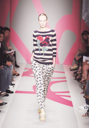 而DKNY 2010春夏女裝秀場讓人不禁在想:設計師唐娜·凱倫 (Donna Karan) 是不是做了個斑斕的鮮花美夢?將服裝描繪得如此花團錦簇,色彩明艷。黑色,灰色,海軍藍或卡其等中性的都市色彩作為基色,上面涂抹著栩栩如生的花朵涂鴉線條或多彩而濃重的抽象圖案,有玄武黑、牡丹紅、橘紅色、鎳灰色及鼠尾草綠!獩]錯!“City in Bloom”開花中的城市,正是本場秀的主題。
