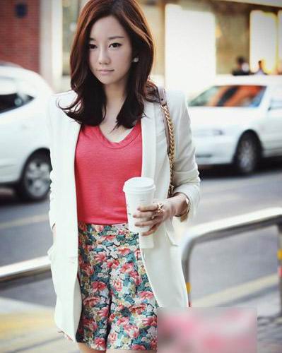 紅綠配色的花朵紋樣點綴在柔軟的高腰短褲上,搭配西瓜紅色底衫和純白色西服夾克,用艷麗的復古色彩描繪摩登大女人的輪廓。