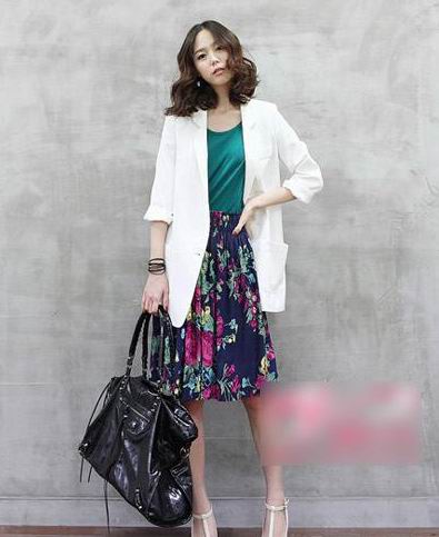 深藍底色的中長裙,點綴紫羅蘭色的印花圖案,頗有八九十年代的韻味,搭配光澤感綠色底衫和白色夾克,制造冷艷御姐Style!